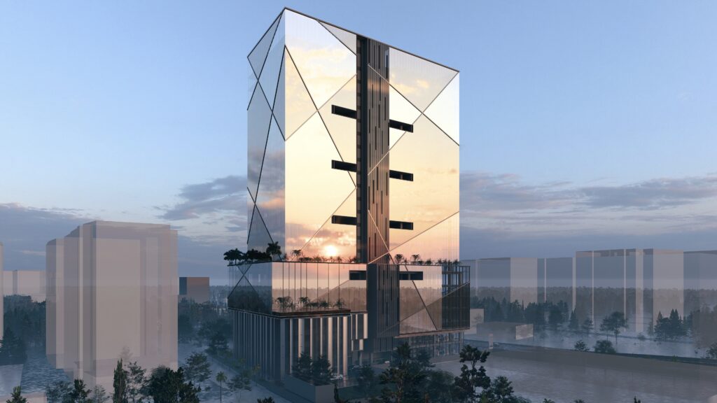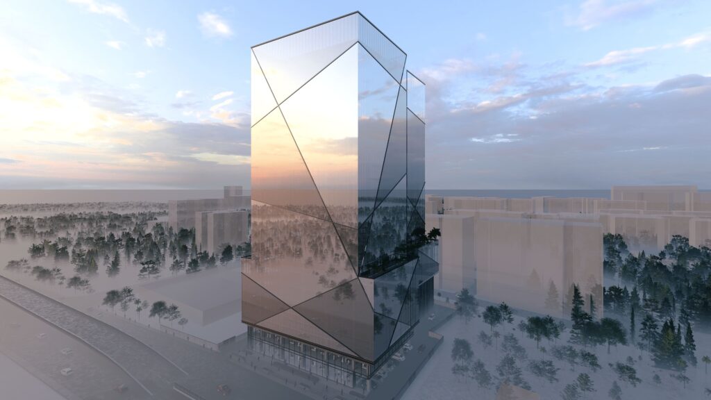 The defining idea of this tower lies in its glamour-inspired façade, imagined as a dynamic play of light and material—almost like a building that comes alive through illumination. The concept explores a refined expression of two-toned glass architecture, creating depth, rhythm, and a constantly changing visual character throughout the day and night.