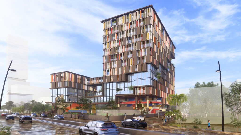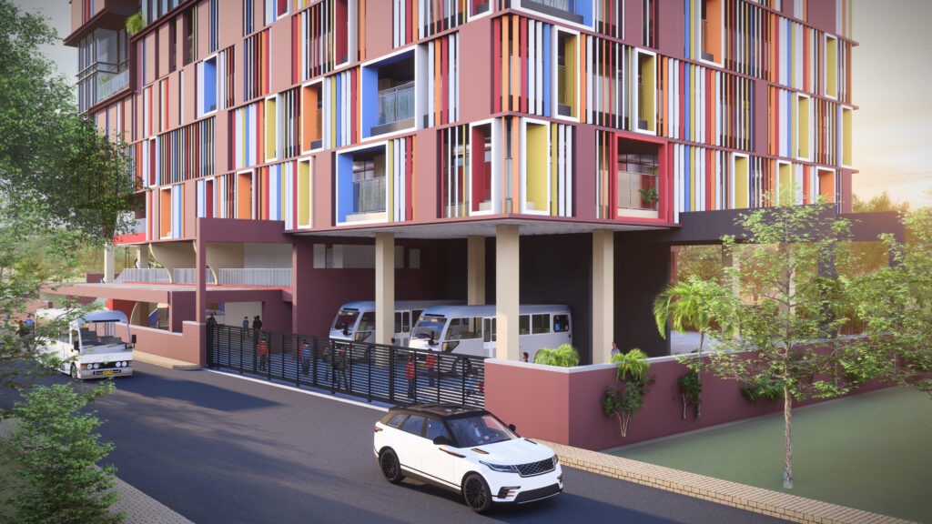 The school is planned as a Platinum-Plus rated development, reflecting strong environmental responsibility and long-term operational efficiency. A distinctive semi-sheltered campus concept forms the backbone of the design—creating protected yet open learning zones that respond to climate, comfort, and student interaction.